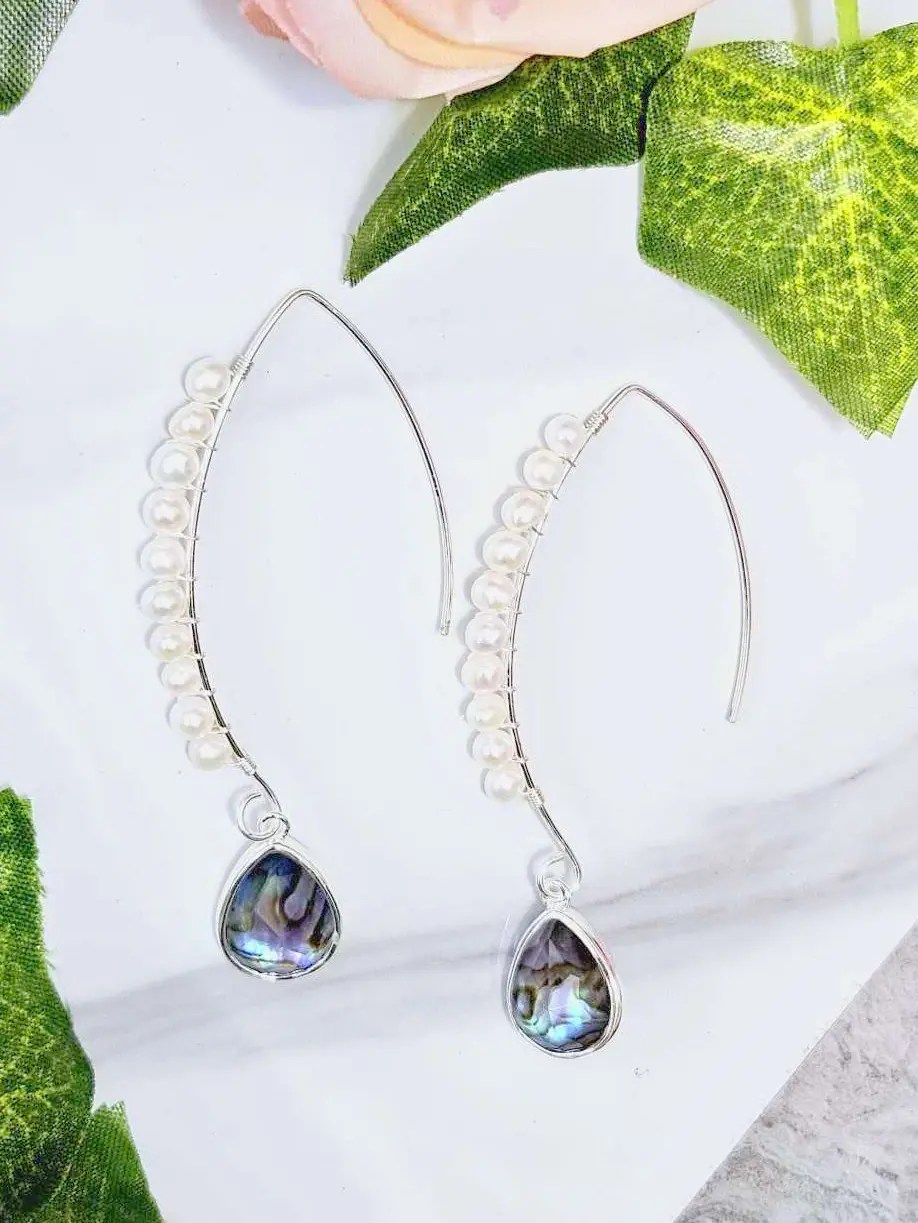 Material: Sterling Silver V shaped Earring Hook, Silver Plated Over Brass Charm, Freshwater Pearl, Abalone