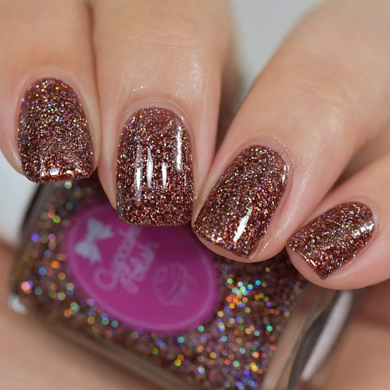 Pursue Your Talent is a super sparkly brown full coverage holo microglitter polish. The holo glitters are densely packed and full coverage, yet lay flat (minimal texture) and remove easily with acetone.