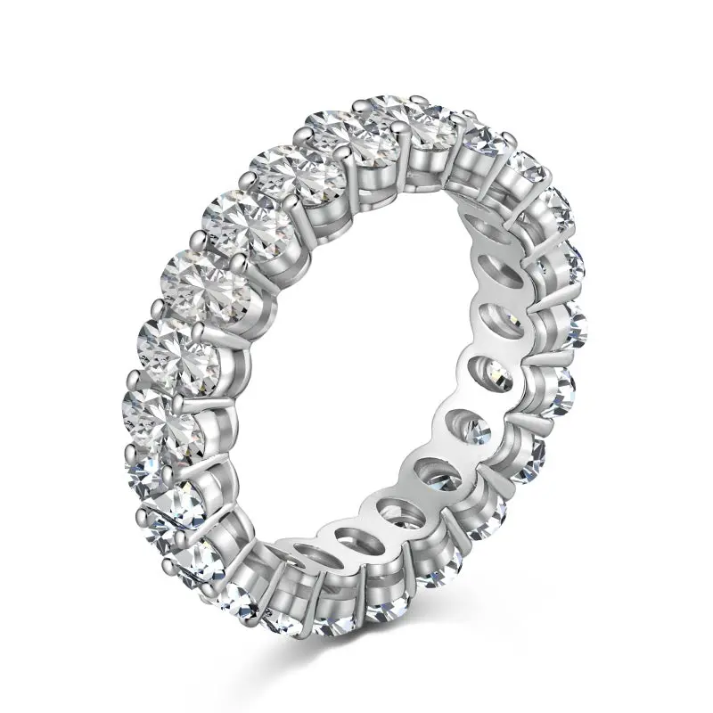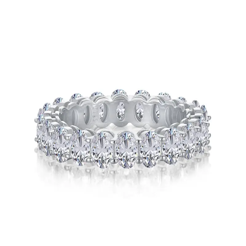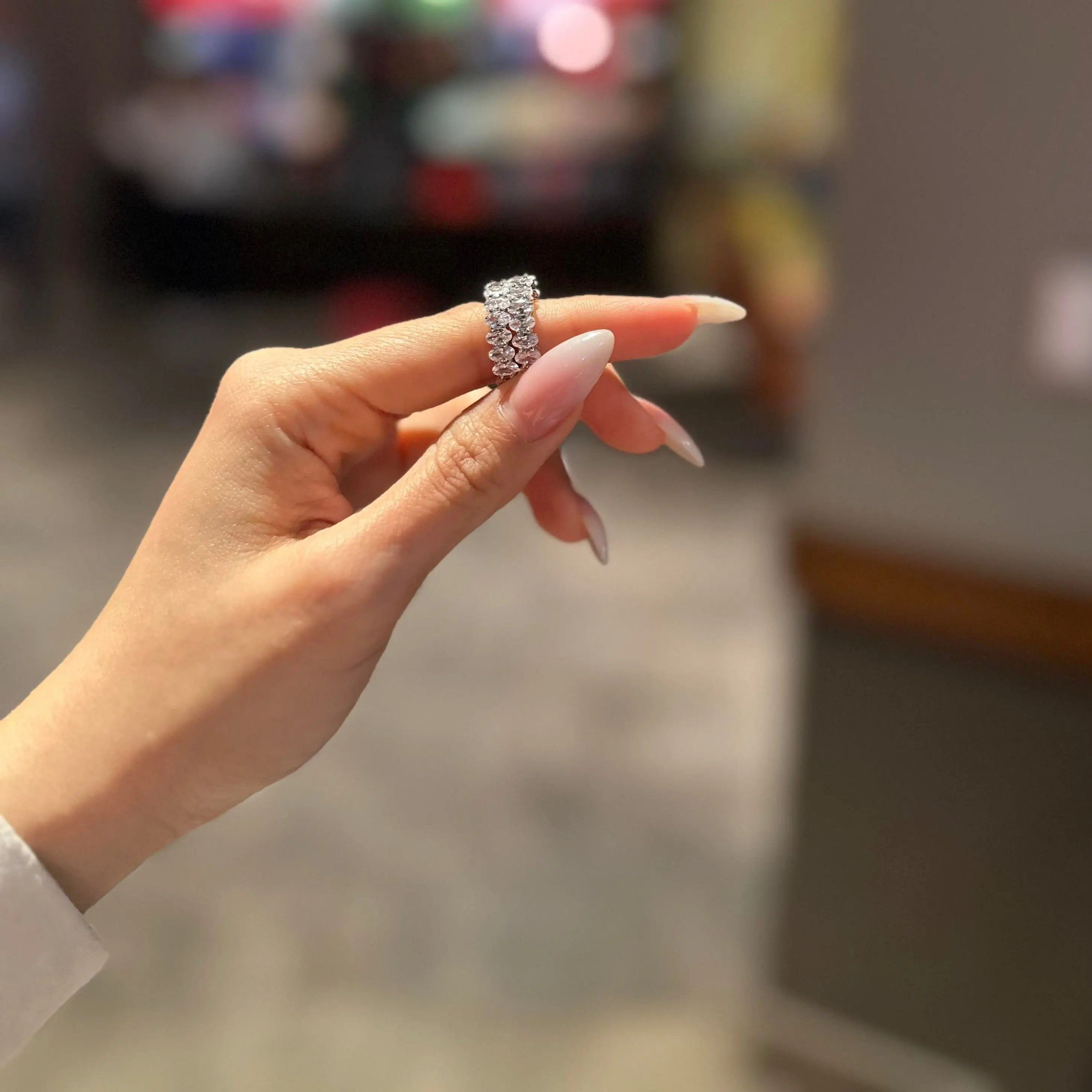 Our tribute to Dallas! This ring has a special place in our hearts at Socialite's Secret and we're obsessed with wearing it! Our dazzling Dallas Eternity band showcases high-quality oval-cut cubic zirconia surrounding the entire band. This effortless band is crafted with 925 sterling silver, ideal for those with sensitive skin, and coated with rhodium for added shine and durability. We suggest getting an extra to stack on for a glam look! They'll fit perfectly side by side.