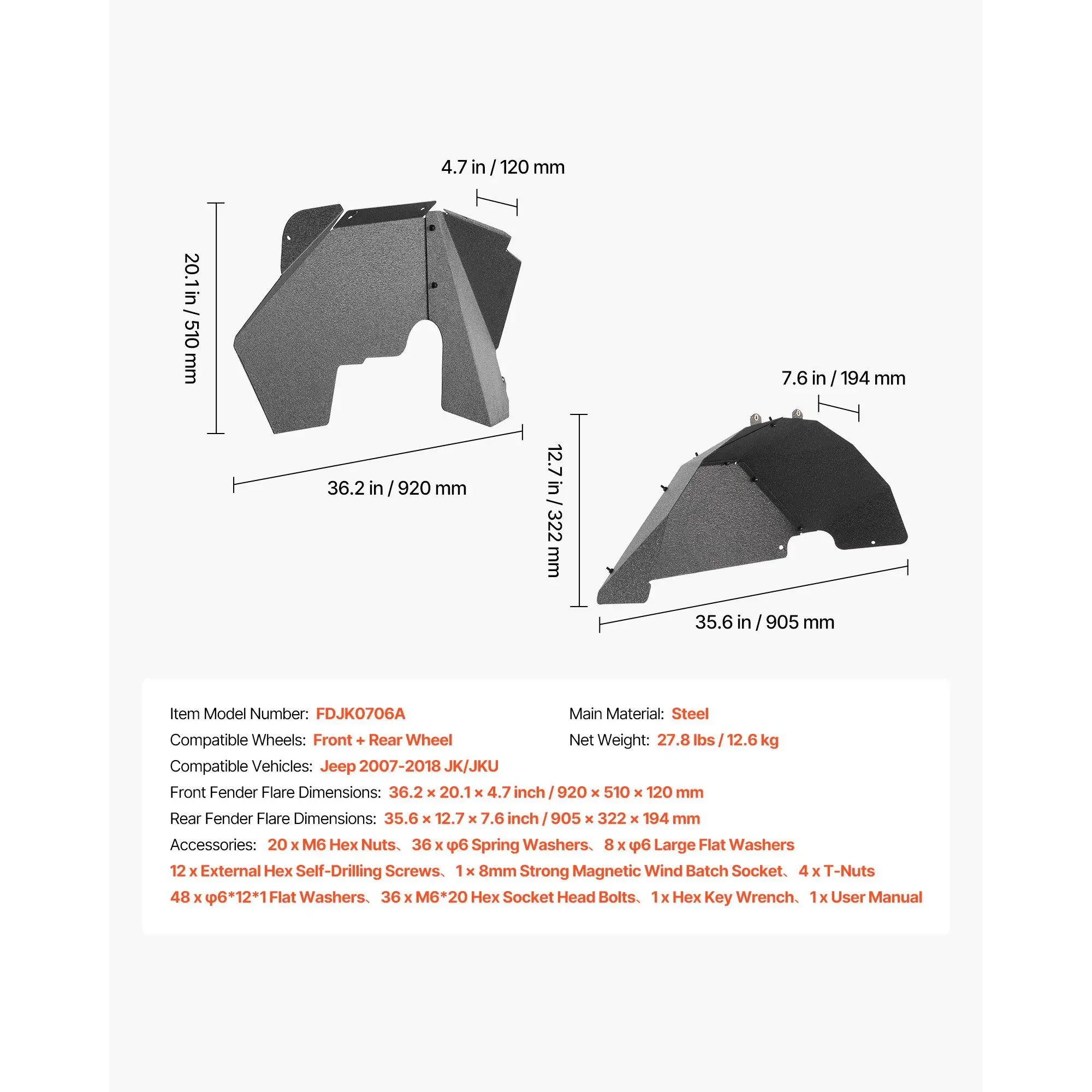 Compatible Wheels: Front + Rear Wheel,Item Model Number: FDJK0706A,Compatible Vehicles: Jeep 2007-2018 JK/JKU,Front Fender Liner Dimensions: 36. 2 x 20. 1 x 4. 7 inch / 920 x 510 x 120 mm,Net Weight: 27. 8 lb / 12. 6 kg,Rear Fender Liner Dimensions: 35. 6 x 12. 7 x 7. 6 inch / 905 x 322 x 194 mm,Main Material: Steel