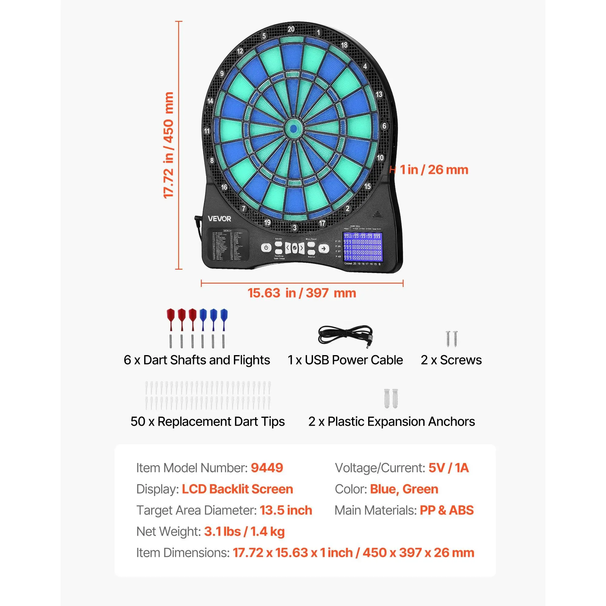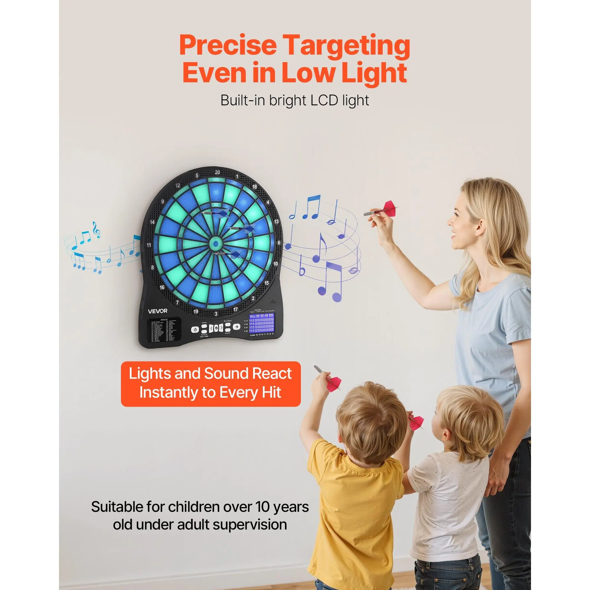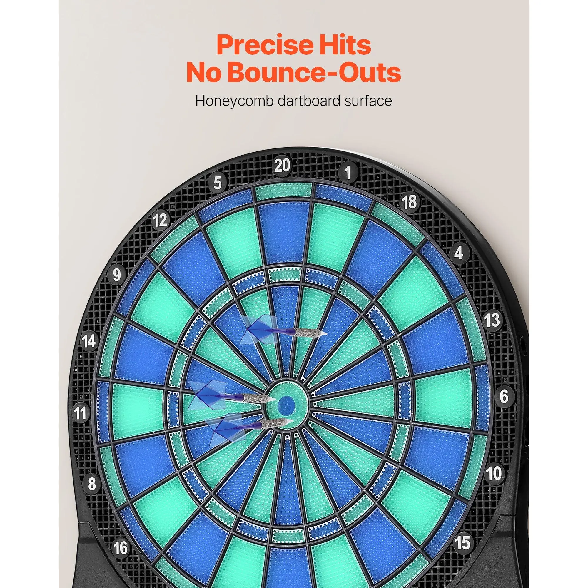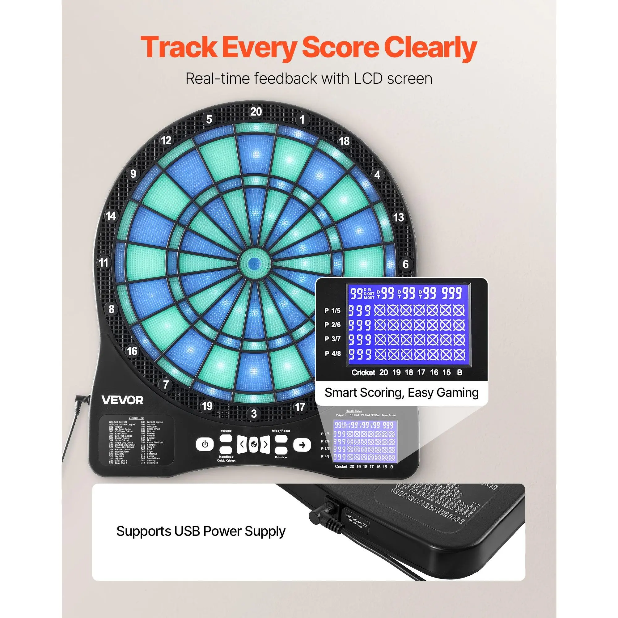 Versatile Gameplay: Enjoy the game to the fullest with this electronic dartboard, preloaded with 48 game modes like Cricket and Count-Up, offering 500+ gameplay combinations.Supports up to 8 players, perfect for family gatherings, office entertainment, holiday parties or bar eventsReduced Bounce-Outs: Our electronic dart board features a honeycomb target design with finely partitioned edges to improve hit rate and minimize bounce-outs.Combined with the included soft dart tips, it allows for safe, free play without damaging your wallsTrack Every Score Clearly: This target surface is built in LED lighting for accurate aiming even in low light.LCD screen shows real-time scores and round progress, with miss dart detection, single/double bullseye option, single/double in-out option, player-vs-computer mode, enhancing the playing challenge and funEasy Use & Setup: Includes 6 dart shafts and flights, 50 replacement dart tips, 1 USB power cable, 2 plastic expansion anchors, 2 screws, and a user manual.No complicated setup-just mount and play, making it perfect for both beginners and enthusiastsDurable to Use: Measuring 17.72" x 15.63" with a 13.5" target area, this electronic dartboard is made from high-strength PP + ABS plastic.It delivers a stable, long-lasting surface that resists wear and tear, perfect for daily practice and fun family entertainmentVEVOR Electronic Dart Board, LED-Illuminated Target Dartboard with 48 Games & 500+ Variations, Includes 6 Dart Shafts with Flights & 50 Soft Tips, Cricket Scoring LCD Screen - Supports Up to 8 Players