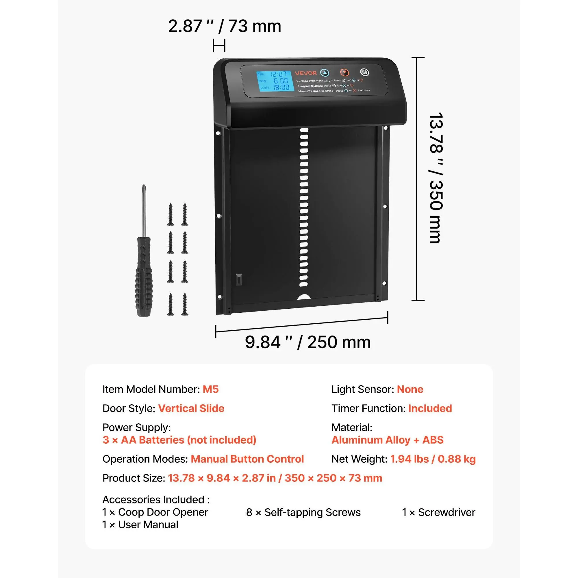 Door Style: Vertical Slide,Item Model Number: M5,Material: Aluminum Alloy + ABS,Light Sensor: None,Net Weight: 1. 94 lbs / 0. 88 kg,Timer Function: Included,Power Supply: Battery Powered,Operation Mode: Manual Button Control,Product Size: 13. 78 * 9. 84 * 2. 87 in / 350 * 250 * 73 mm