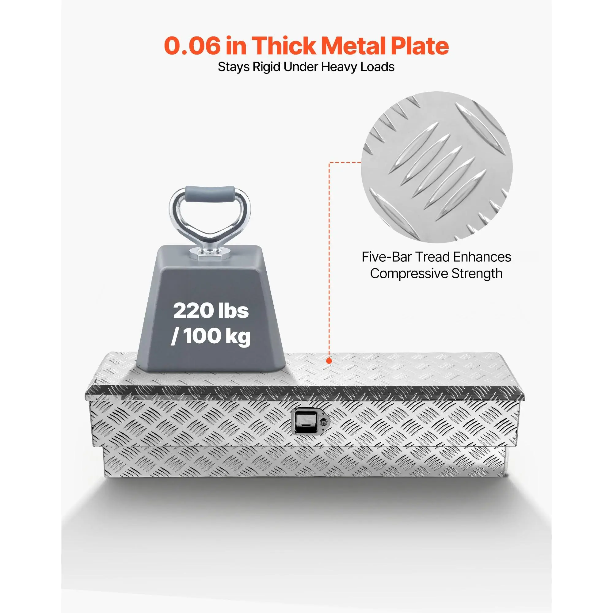 Strong Load-Bearing: Constructed from 0.06 in / 1.4 mm metal panels with tread patterns to enhance strength, the step platform can support up to 220 lbs / 100 kg.The truck tool box handles heavy load of tools, providing stable storage solutionDual Sealed Protection: Featuring seamless welding combined with built-in rubber sealing strips, this truck toolbox provides dual-layer protection.Even in rainy or humid conditions, your tools stay dry and clean, helping avoid corrosion and extend lifespanLarge Capacity Storage: Our truck bed box provides 3.56 cu ft (101 L) of storage capacity and can hold up to 33 lbs / 15 kg per item.From tools and equipment to other essentials, everything can be neatly organized, meeting diverse storage needsSecure & Anti-Theft Design: Equipped with a reliable latch that stays firmly closed, avoiding items from spilling during transport.It comes with padlocks for added security, giving you peace of mind that your tools and belongings are protectedVersatile Applications: This truck toolbox can be installed on pickup trucks, RVs, trailers, and more.Whether for daily transport, outdoor adventures, or on-site work, it fits multiple scenarios and keeps your tools organized wherever you need themVEVOR Truck Bed Tool Box, Heavy Duty Aluminum Tool Box with Tread Patterns, Storage Toolbox Chest Organizer with Lock and Key, Ideal for Pickup, Truck Bed, RV, Trailer, 48 x 13.4 x 13 in, Silver