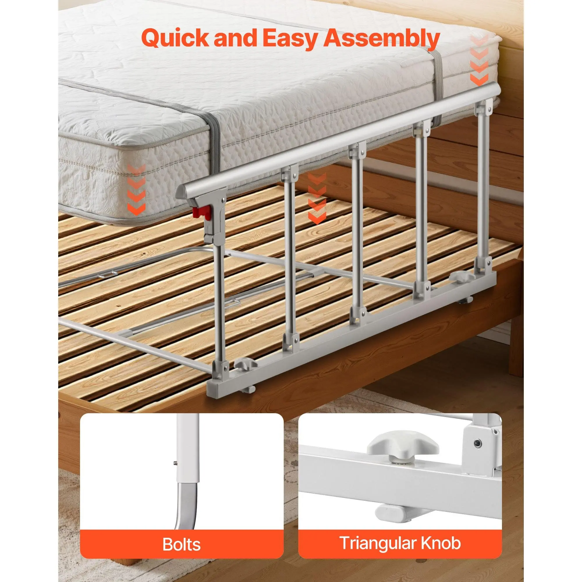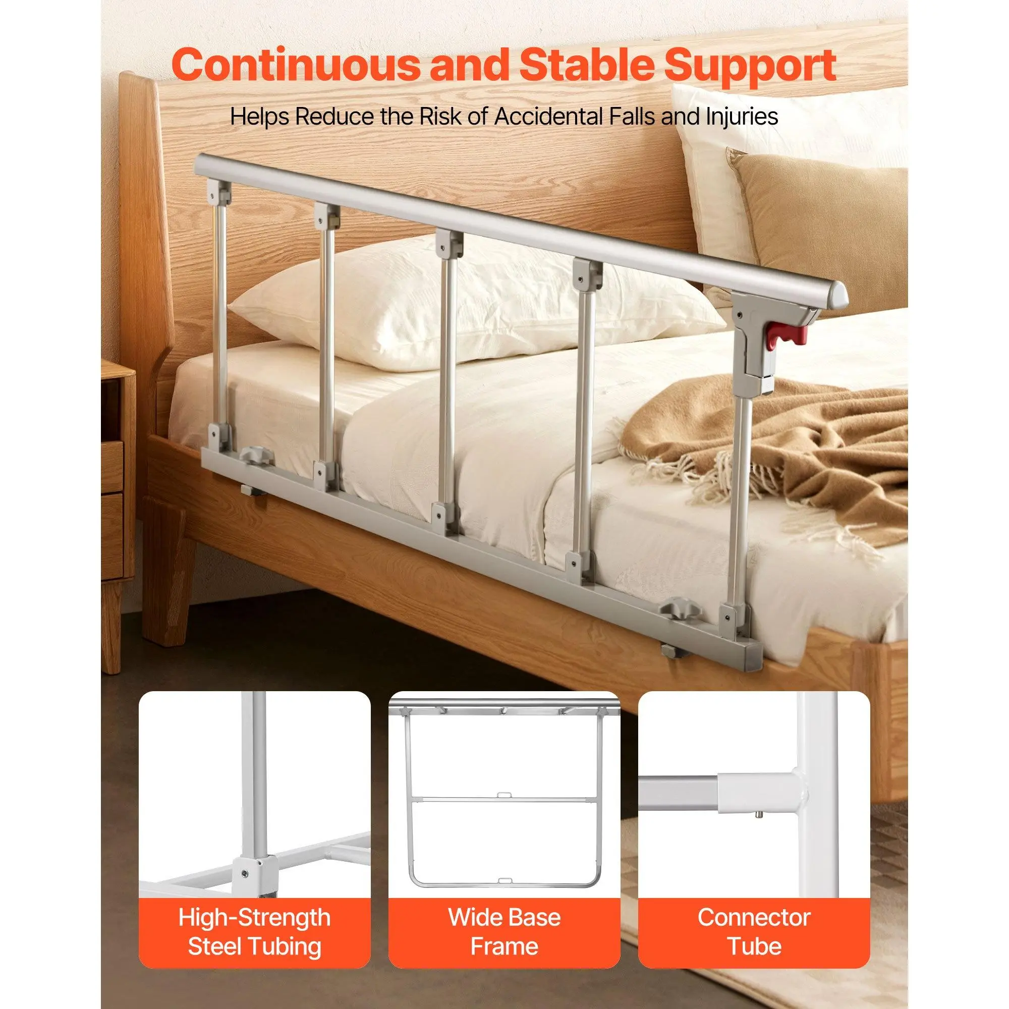 Foldable Design: When not in use, press the red button to fold the rail down.This design won’t interfere with getting in or out of bed and reduces bumps or trips.Fits double, queen, and king beds with 7–13 in / 178-330 mm mattresses.Not for electric bedsSecurity & Reliability: Made of high-quality metal, this bed rail provides stable support for adults, reducing the risk of falls and injuries.CE and FDA certified, with a widened base frame and added middle connecting tube to minimize wobblingEnhanced Comfort: The flat, elongated bed assist rail distributes pressure across the mattress, keeping the surface smooth and free of uncomfortable bumps.This design also avoids localized pressure from deforming the mattress, protecting its longevityWide Application: This bed side rail avoids falls and provides secure support on the bed.Ideal for elderly people, individuals with disabilities, pregnant women, and post-surgery patients.Not recommended for electric beds.Quick & Easy Installation: The elderly bed rail is easy to assemble without tools or professional help.Simply follow the instructions to set it up in minutes.VEVOR Foldable Bed Rail for Elderly, 48 in Bedside Assist Rail with Fixing Strap, Adjustable Height Pipe Bedside Cane, High-Strength Metal Senior Bed Bar, Hand Guard Grab Fits King, Queen, Full, Twin