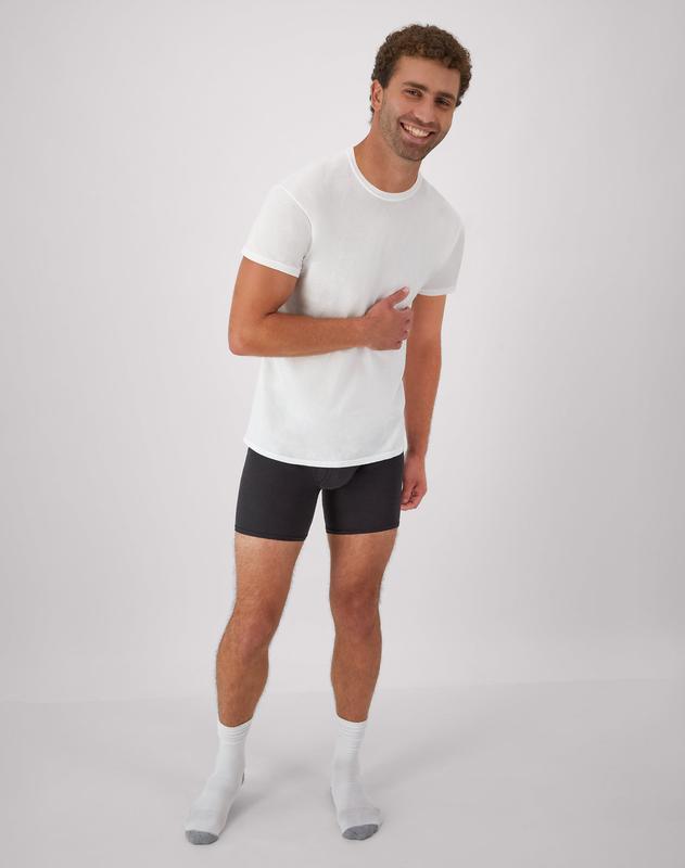 A CLASSIC THAT KEEPS GETTING BETTER This Hanes men’s cotton t-shirt takes a classic wardrobe basic to a new level. Crafted with ComfortSoft® cotton fabric, this style now features a longer length and all-day flex fabric that moves with you and maintains the fit you expect. The long length means these essential undershirts stay tucked in, making them the ideal layering piece. Finished with a stay-flat crew neckline, this men’s undershirt offers an itch-free Tagless® interior. Innovative Cool Comfort™ moisture-wicking technology keeps you cool and comfortable. Stock up with this 6-pack of white undershirts and enjoy the comfort of Hanes, today and every day. *America's #1 Men's Underwear Brand - Source: Circana/Consumer Tracking Service, U.S. Sales, Underwear Bottoms and Undershirts, 12 months ending November 2023.
