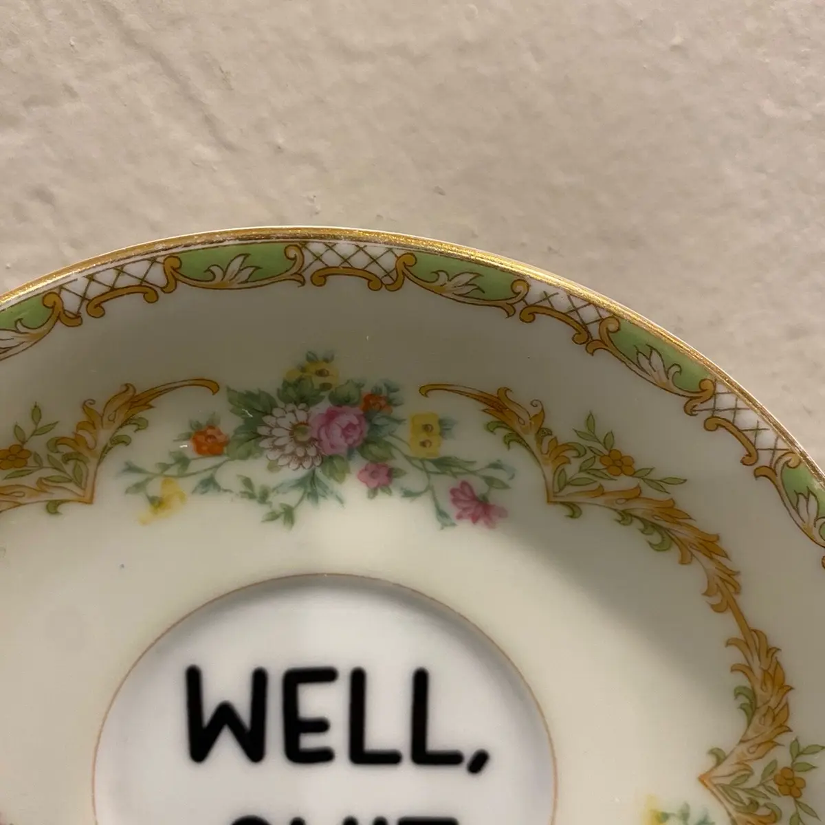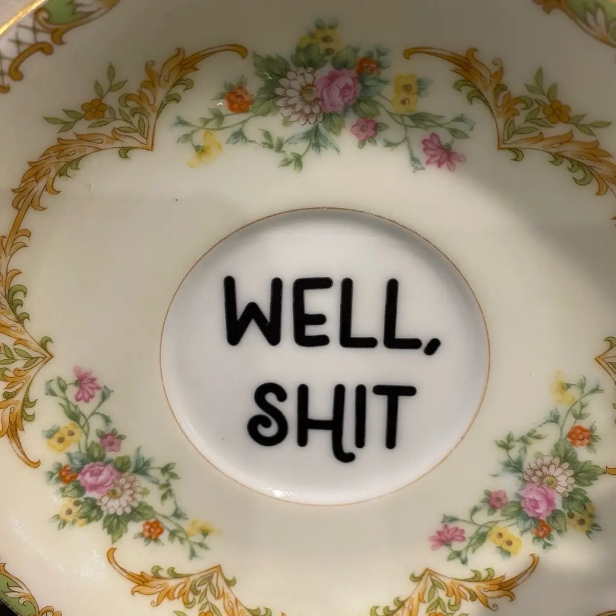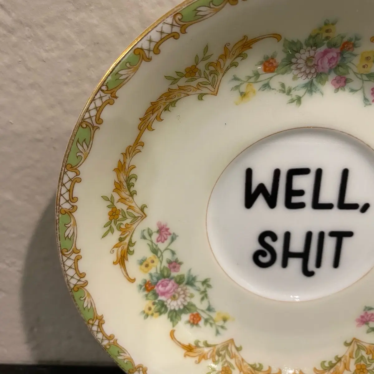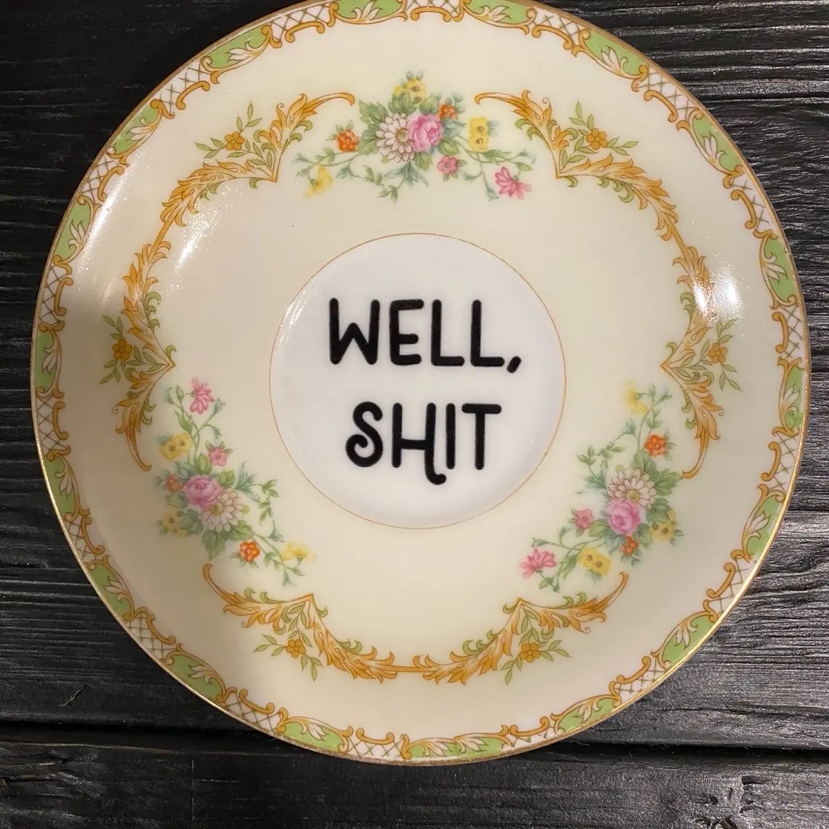 Measuring 5.5 inches wide, this plate features a hand-applied decal that adds a unique and personalized touch to your home. The decal reads "Well, shit," making it a fun and playful addition to your dining room or kitchen.