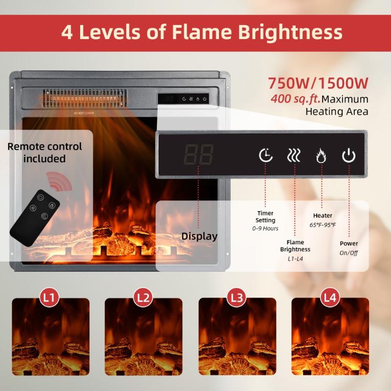 The electric fireplace has 4 levels of adjustable brightness. Whether it is heated or not, it can display a 3D realistic flame effect, adding a retro and elegant atmosphere to your space.