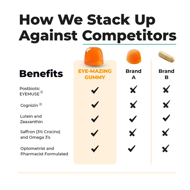 Made with patented and Clinical Research Ingredients: Eyemuse postbiotic, Cognizin citicoline, Lutein, Zeaxanthin, Omega 3, Saffron, and nutrients studied in eye and cognitive wellness research. This gummy supports overall eye health and visual wellness as part of a daily routine.