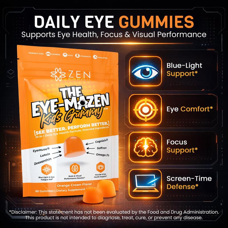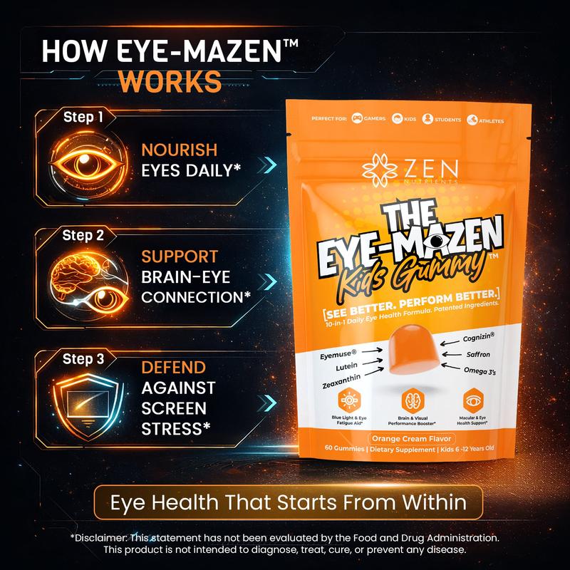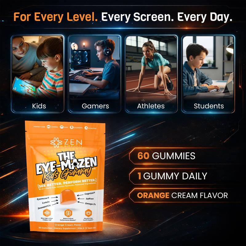 Zen Nutrients Eye-Mazen Gummy (Kids) is an innovative 10-in-1 powerful eye wellness gummy created for growing kids in a screen-filled world, where 69% of the population now suffers from Digital Eye Strain.