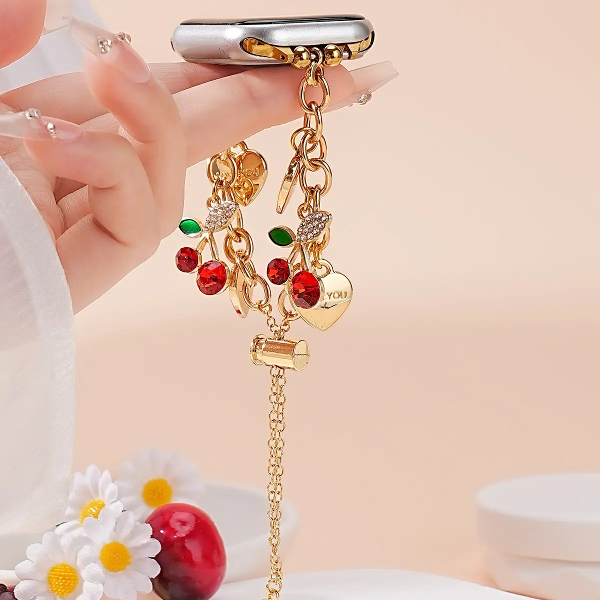 Women's Metal Chain Apple Watch Band, Heart Cherry Charm Bracelet Strap for Iwatch 38-49mm, Perfect Gift for Birthday & Valentine's Day
