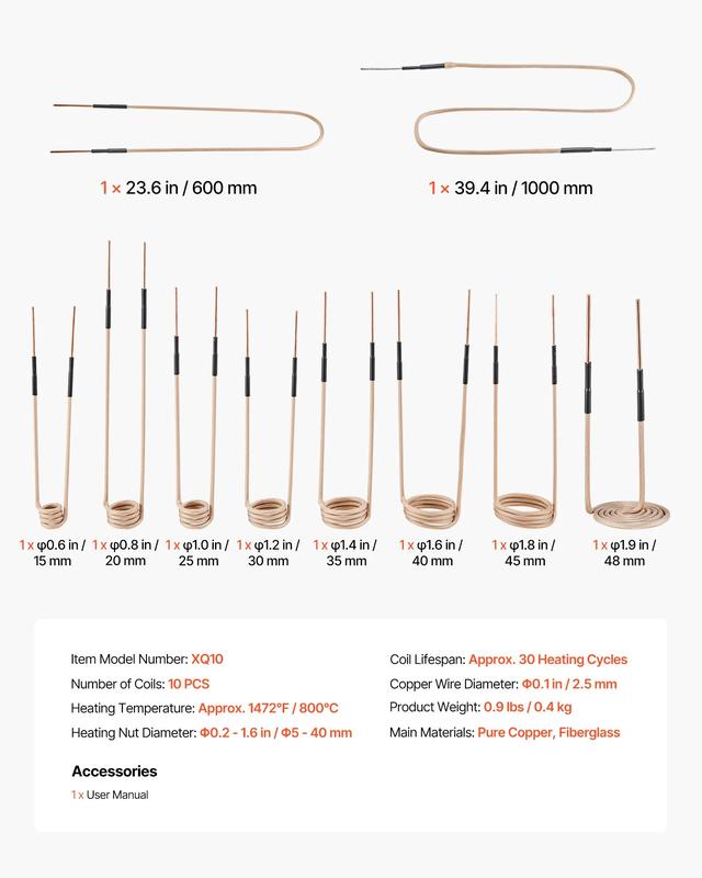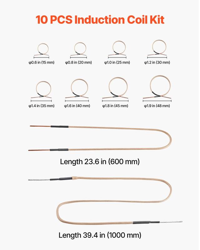 ·10-piece Coil Set: The heater coil kit includes 8 standard coils of different diameters, compatible with nuts ranging from 0.2-1.6 in / 5-40 mm, providing precise and efficient heating. The U-shaped and flexible coils are designed to handle irregular parts, long shafts, and curved workpieces. Suitable for a variety of vehicle and equipment maintenance