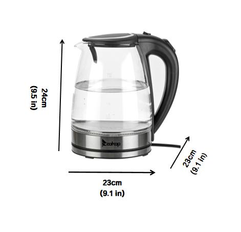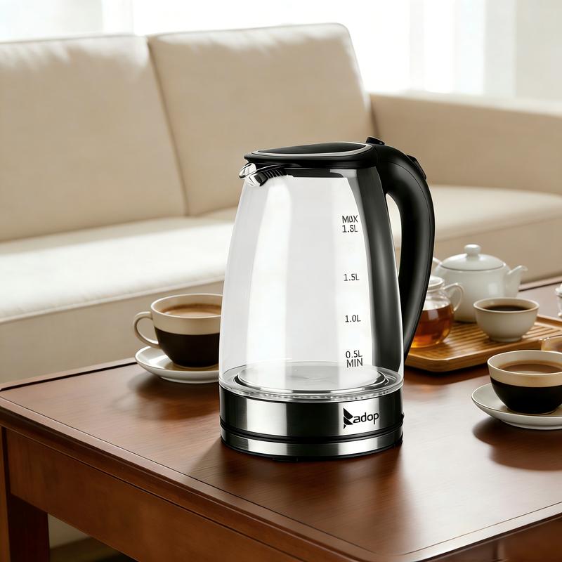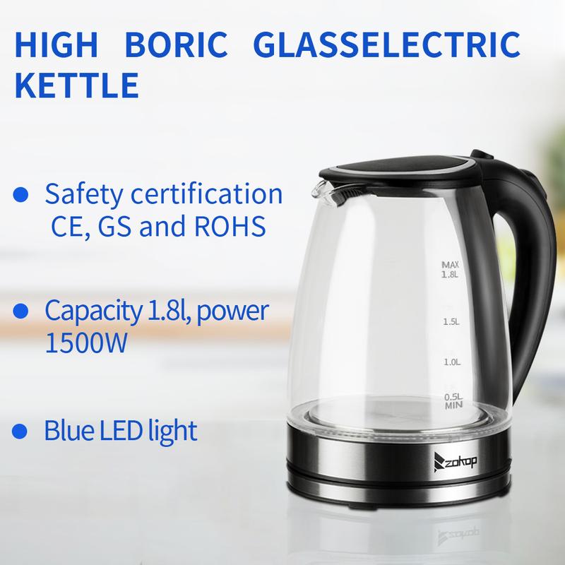 ·10V 1500W 1.8L Electric Glass Kettle is the perfect blend of elegance and functionality. Not only is this kettle a beautiful addition to any kitchen countertop, but it also boils water efficiently, saving time and energy over the use of conventional stovetop kettles. A halo of blue LED lights beautifully illuminates the pot when it's in use, so it's not only practical, but very attractive to look at. In a matter of minutes, hot water will be ready to use for instant coffee, tea, hot cereal, instant macaroni, soup, or oatmeal.