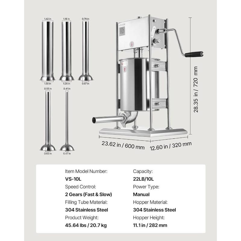 VEVOR Electric Sausage Stuffer, 22 LBS/ 10 L Vertical Meat Stuffer, Stepless Speed Control and Foot Pedal, Stainless Steel Heavy Duty Sausage Filler with 4 Stuffing Tubes, for Commercial Home UseVEVOR Electric Sausage Stuffer, 22 LBS/ 10 L Vertical Meat Stuffer, Stepless Speed Control and Foot Pedal, Stainless Steel Heavy Duty Sausage Filler with 4 Stuffing Tubes, for Commercial Home Use