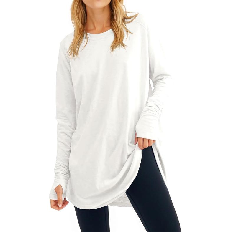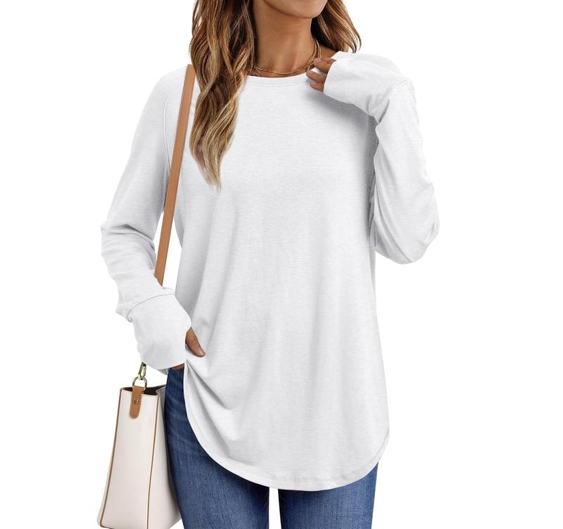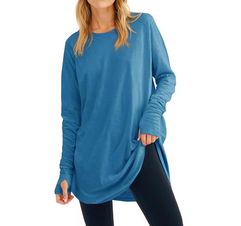 ·Features:Casual pullover tunic round neck tops with thumb holes,crew neck loose T-shirt,round hem,solid color top.The curved hem will bring some much needed “oomph” to your day-to-day looks.
