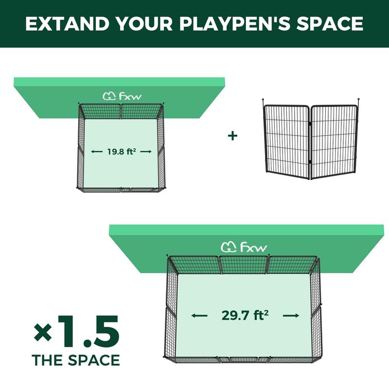 【2½ min Quick Assembly Dog Playpen - Designed for RVers】We noticed that 40% of FXW members are RV travelers who need to assemble and disassemble the fence frequently. Therefore, we decided to design a pen that can be assembled quickly. The result is a new 180°- rotatable hinged panel with patented technology (NO.: US D1012317S). It can save at least 60% of the installation time when compared to conventional structure. An 8-panel dog fence can be set up in just 2m38s.