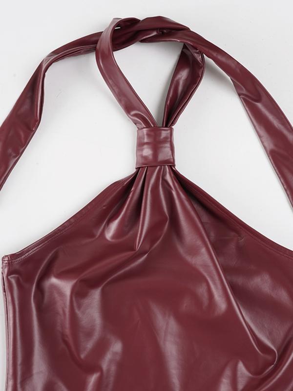 Y2K Knot PU Leather Halter Vest, Slim-Fitting Backless Design, Plain Pattern, Y2K Style, Perfect for Casual Wear