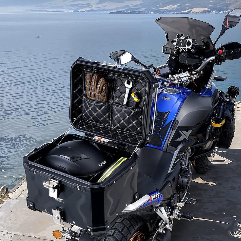 VEVOR Motorcycle Top Case, Universal Aluminum Alloy Motorbike Tail Box with Leather Lining, 55L Waterproof Detachable Motorcycle Top Box with Lock Back Cushion, Fit for 99 of Motorcycle FramesVEVOR Motorcycle Top Case, Universal Aluminum Alloy Motorbike Tail Box with Leather Lining, 45L Waterproof Detachable Motorcycle Top Box with Lock & Back Cushion, Fit for 99% of Motorcycle Frames Sturdy and Reliable Spacious Capacity Item Safeguard Easy Installation Convenience &