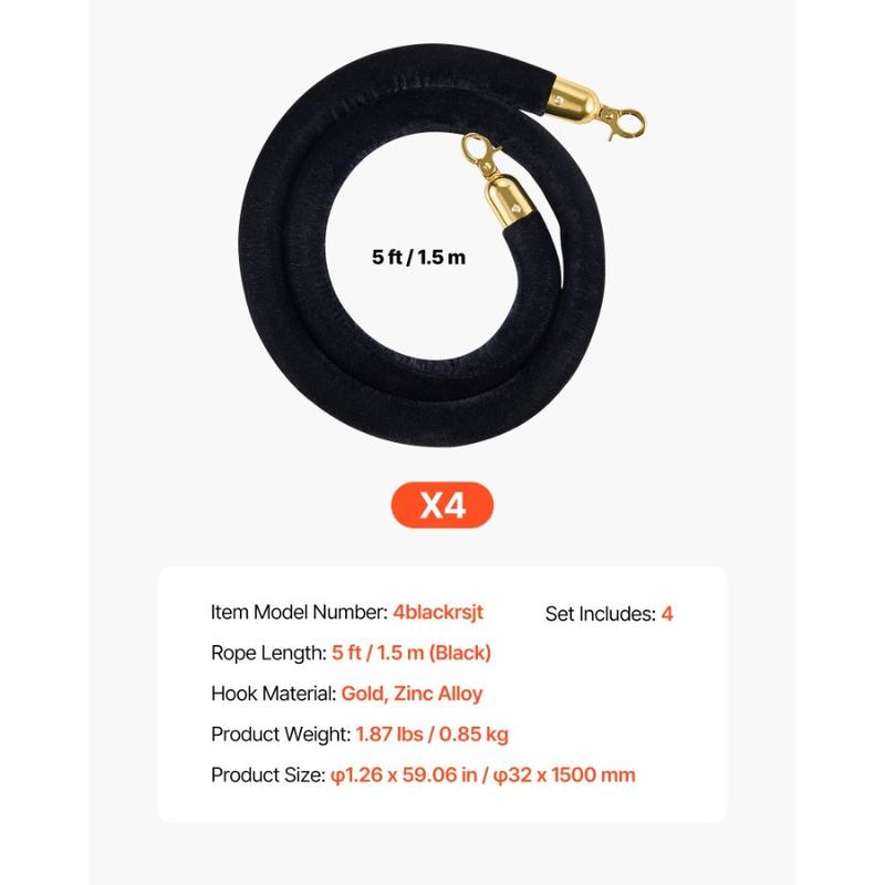 VEVOR 4 Pcs Black Velvet Stanchion Ropes, 5 ft Crowd Control Stanchion Black Velvet Ropes with Gold Hooks, Post Queue Barrier Carpet Rope for Carpet Events Movie Theaters Grand Openings Hotels PartyVEVOR 4 Pcs Black Velvet Stanchion Ropes, 5 ft Crowd Control Stanchion Black Velvet Ropes with Gold Hooks, Post Queue Barrier Carpet Rope for Carpet Events Movie Theaters Grand Openings Hotels Party Premium Velvet Zinc Hooks Foam Core Clip-On Design Wide Use Ideal