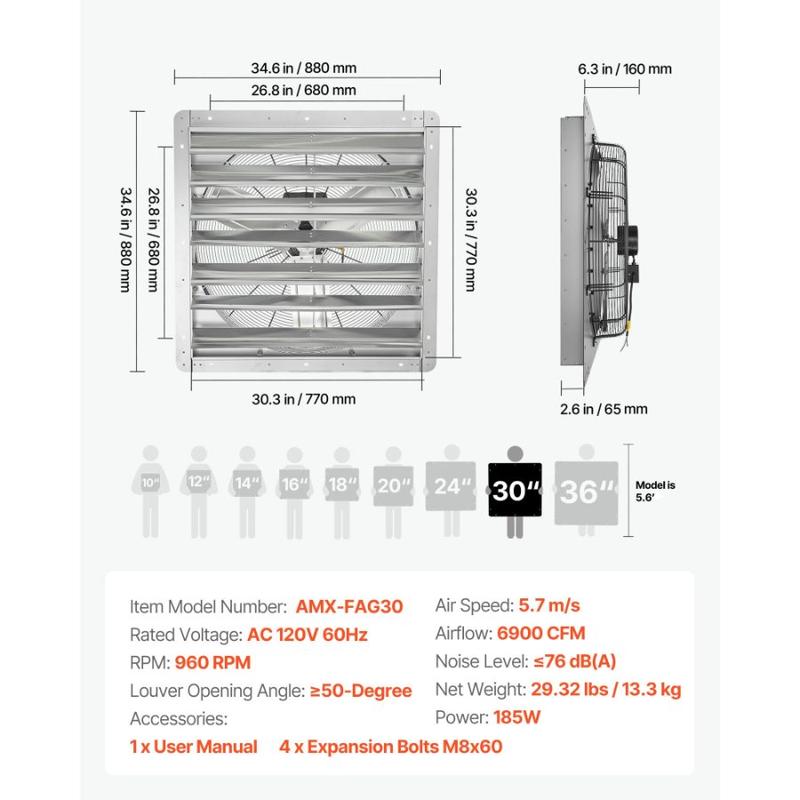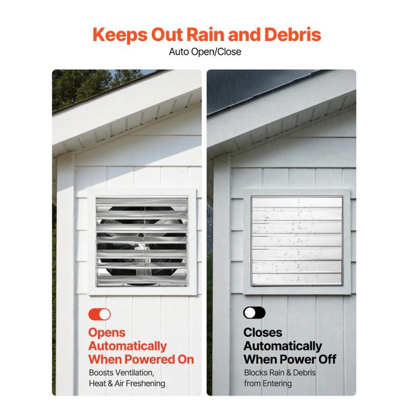VEVOR 36 inch Shutter Exhaust Fan, Wall Mounted Attic Vent Fan with 11000 CFM Airflow, AC Motor, Heavy - duty Steel Construction, Low Noise for Shed, Garage, Greenhouse Ventilation Cooling, SilverVEVOR 30 inch Shutter Exhaust Fan, Wall Mounted Attic Vent Fan with 6900 CFM Airflow, AC Motor, Heavy-duty Steel Construction, Low Noise for Shed, Garage, Greenhouse Ventilation Cooling, Silver Electrostatic Coating Spiral Fan Blades Weather-Resistant Build Robust Housing Flexible