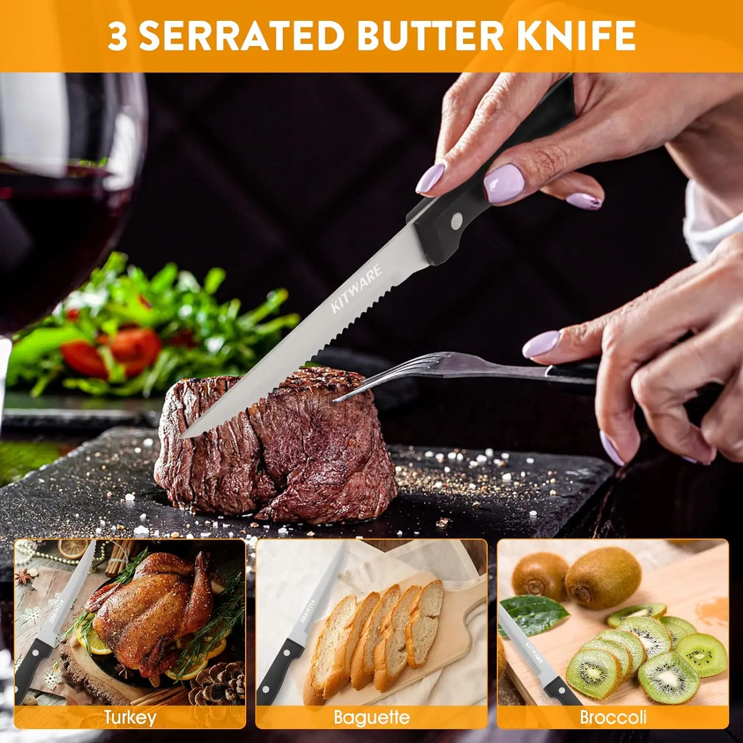 ·Unmatched precision: Each knife boasts a 4.5-inch serrated edge, perfect for effortlessly slicing through your favorite cuts of meat.