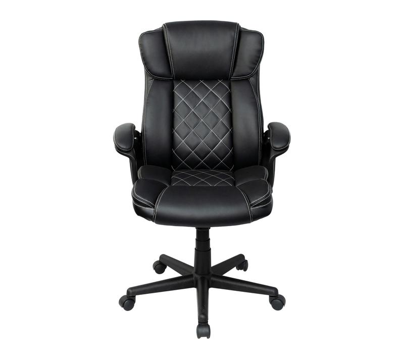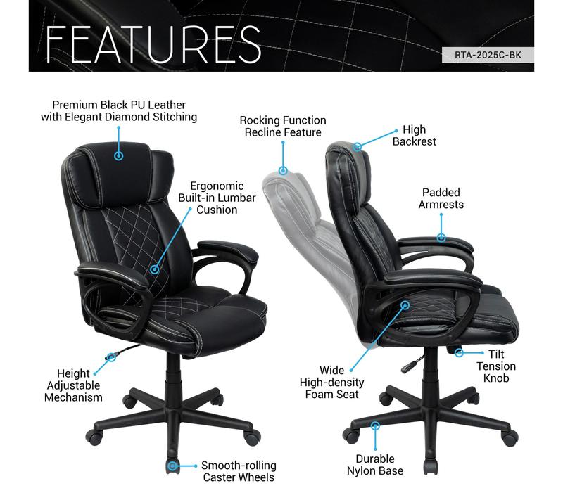 ·Adjustable seat height; tilt-recline function; high back with head and lumbar support; thick padded seat and armrests; diamond-stitched faux leather; heavy-duty 5-star base; smooth-rolling casters