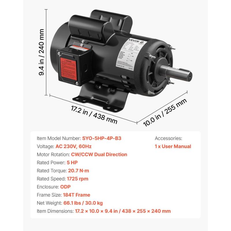 VEVOR 3 HP Electric Motor, 1750RPM Air Compressor Motor, CW/CCW Rotation, 1.125 inch Shaft Diameter, 2.75inch Shaft Length, 12N. m Torque, Single - Phase, TEFC Cooling, 230V, 184T FrameVEVOR 5 HP Electric Motor, 1725RPM Air Compressor Motor, CW/CCW Rotation, 1.125 inch Shaft Diameter, 2.75inch Shaft Length, 20.7N.m Torque, Single-Phase, ODP Cooling, 230V, 184T Frame High-Strength Cast Iron Housing High-Efficiency Cooling Fan System CW/CCW Dual-Direction Capability Efficient Heat