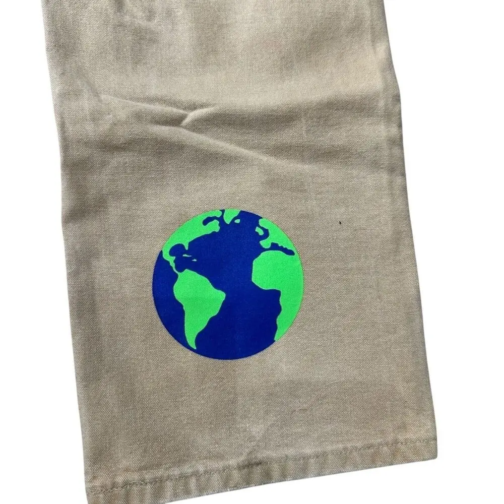 Hand-painted, distressed and reworked with bold patches and eco-inspired artwork.