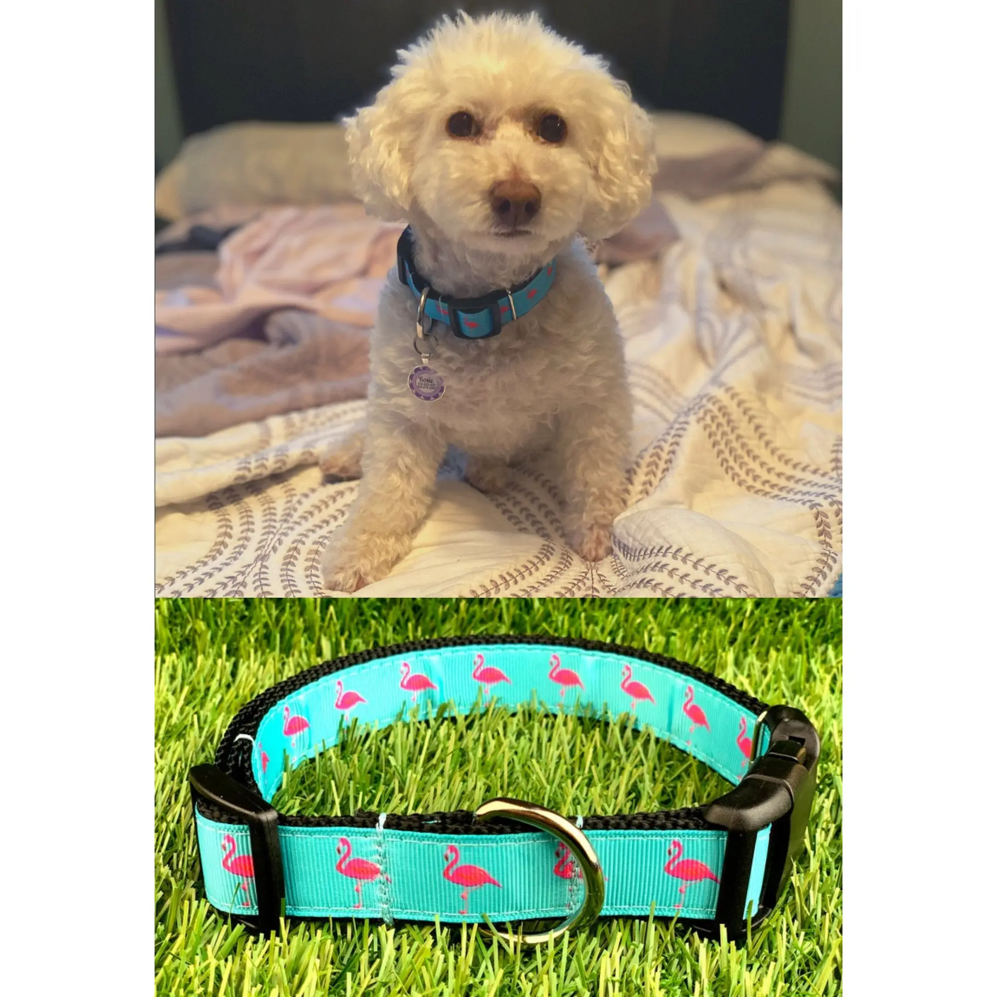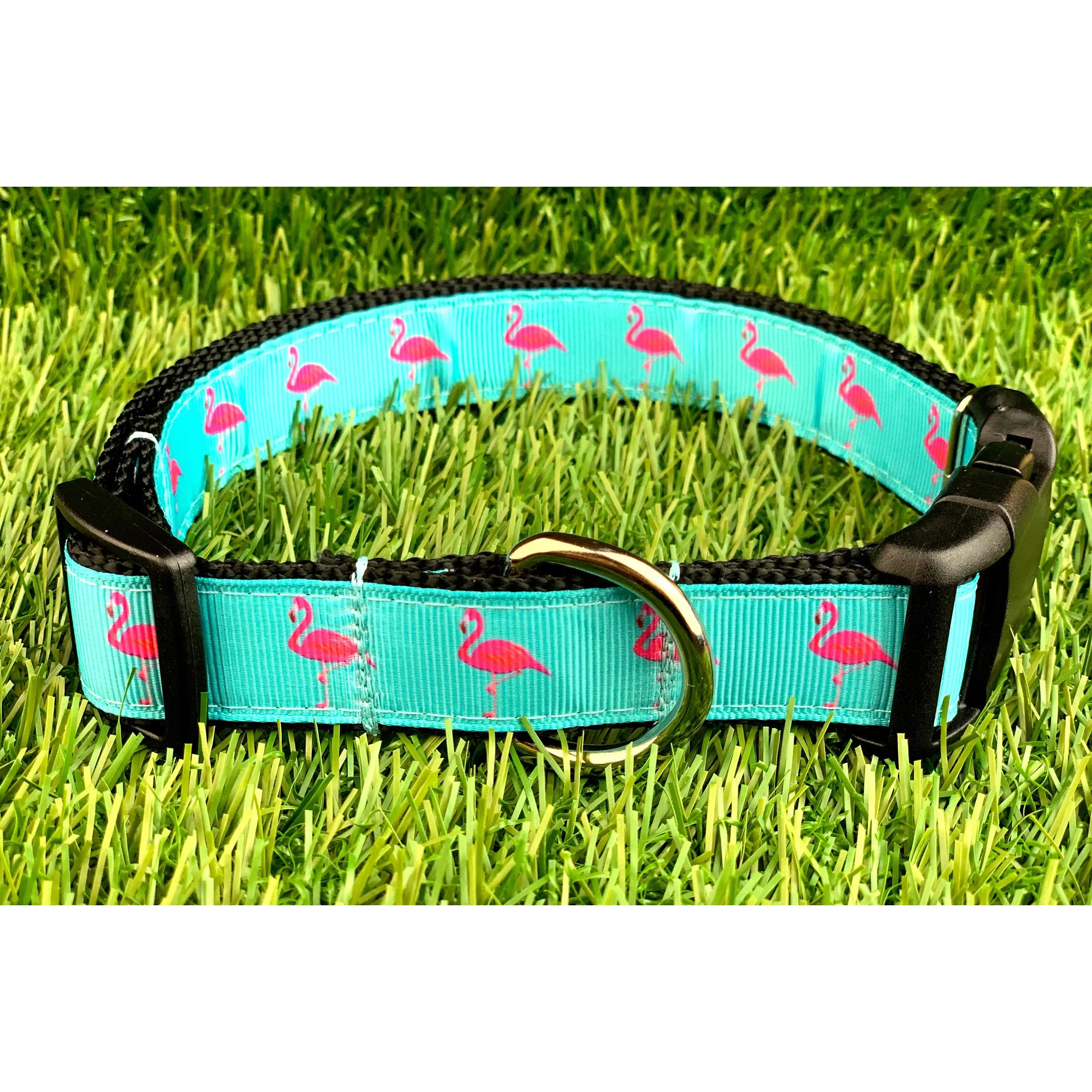 Take your pup's style to the next level with our Teal Pink Flamingo Dog Collar! Handmade with care, this collar features a bold teal flamingo design that is sure to turn heads and add a touch of adventure to any walk. Stand out from the pack with this unique and stylish accessory!