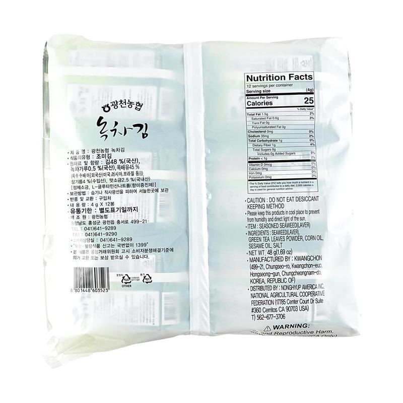 🌿 Discover the savory goodness of NONGHYUP Korean Green Tea Seaweed Snacks! Each pack contains 12 individual servings of delicious, roasted gim, totaling 48g. Perfect for a healthy and light snack anytime, anywhere.