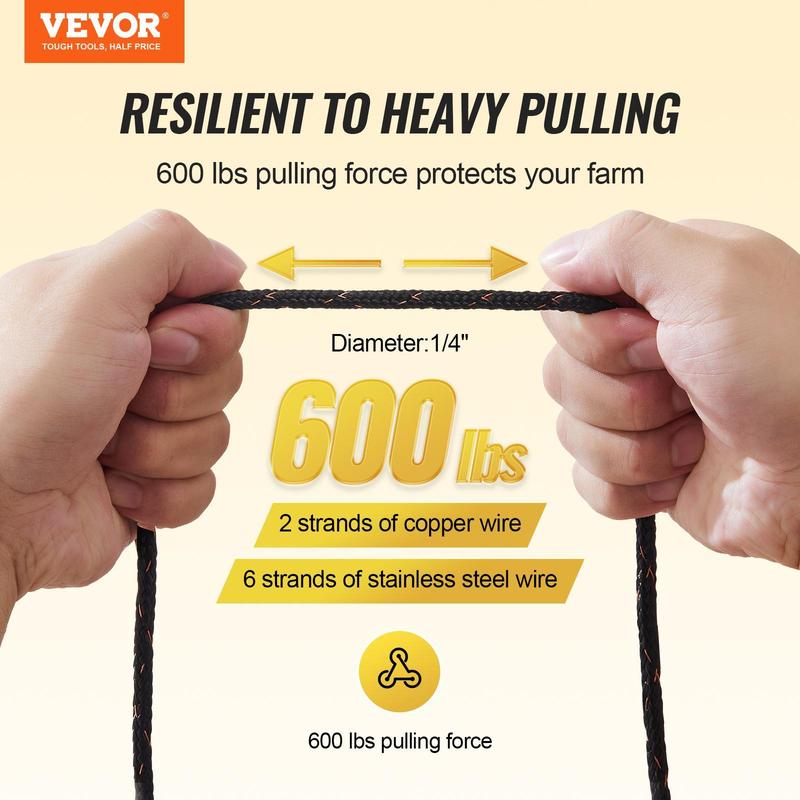 • High Tensile Strength: This electric fence wire boasts exceptional tensile strength, with a diameter of 1/4 inch and the ability to withstand up to 600 lbs of force. Whether used for fencing livestock or preventing wildlife intrusion, its high tensile strength ensures stability and safety, making it ideal for temporary pastures and rotational grazing applications.