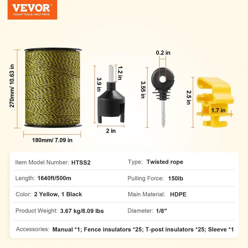 5. VEVOR Electric Fence Wire, , 1640Ft 500M Portable Polywire, 1/8" Diameter 6 Stainless Steel Strands, Fencing Rope Line with 25 Fence Insulators and 25 T-post Insulators, for Horse, Cattle, Livestock