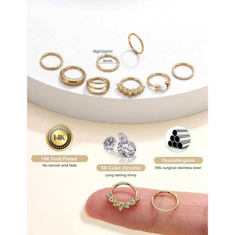 ·Nose Rings Hoops Combination--Gauge size:16G(1.2mm)/18G(1.0mm),Inner diameter: 8mm(0.31 inches)/10mm(0.39inches),Enjoy 8 DIFFERENT STYLE options—2 trendy septum rings, 1 CZ hinged nose hoops, 1 trilple hoop nose ring, 1 opal nose rings and 3 different style nose rings—in classic 14k plated gold or silver, ideal for daily wear or as a clicker septum ring