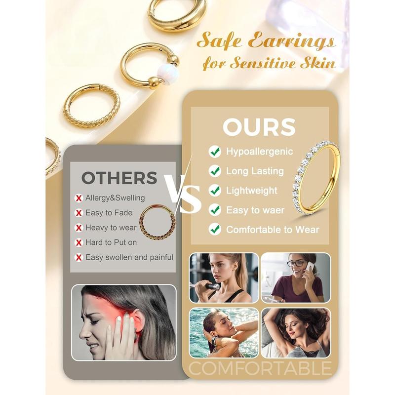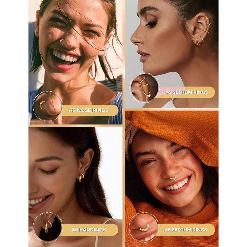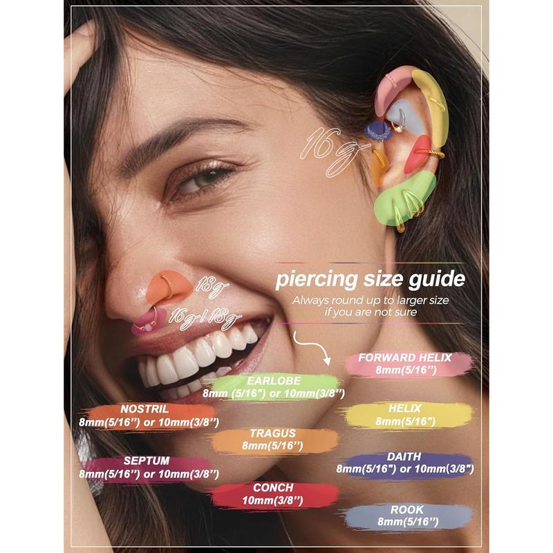 ·Versatile Uses--This piercing jewelry set can be used as nose rings hoops, SEPTUM rings, cartilage hoops, lip rings, helix earrings, daith piercings, and conch piercings.Perfect for any occasion—work, vacations, parties, clubs, birthdays, sports and more