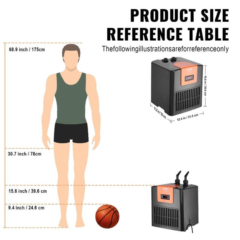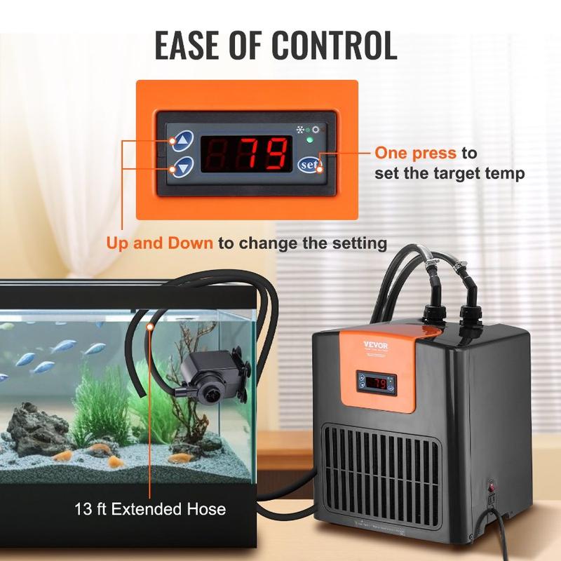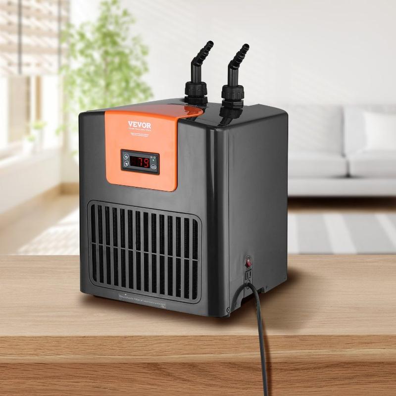 VEVOR Aquarium Chiller 150 Gallon, 1/2 HP Water Chiller for Hydroponics, Fast Cooling for Fish Tank, Axolotl, Coral Reef, Quiet Refrigeration Compressor, Titanium Evaporator, Complete FittingsVEVOR Aquarium Chiller, 52 Gal 196 L, 1/10 HP Hydroponic Water Chiller, Quiet Refrigeration Compressor for Seawater and Fresh Water, Fish Tank Cooling System with Pump/Hose, for Jellyfish, Coral Reef Constant Stable Temperature High-efficient Compressor Premium Titanium Evaporator Excellent
