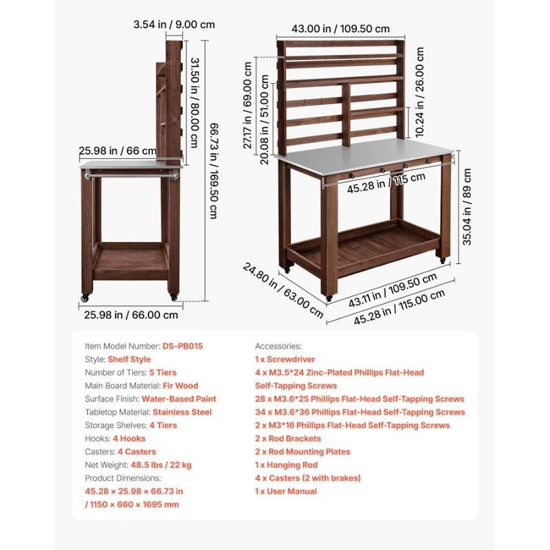 VEVOR Potting Bench Table, Outdoor Gardening Workstation with 45x 26 in Stainless Steel Tabletop, Storage Shelves, 4 Casters, Hooks, Garden Planting Work Station for Outside Patio, Backyard, BrownVEVOR Potting Bench Table, Outdoor Gardening Workstation with 45 x 26 in Stainless Steel Tabletop, Storage Shelves, 4 Casters, Hooks, Garden Planting Work Station for Outside Patio, Backyard, Brown Upright Gardening Work Built to Last Large-Capacity Storage Versatile Application Easy
