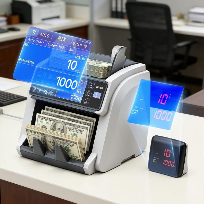 VEVOR Money Counter Machine, Mixed Denomination Bill Cash Counter with CIS/UV/MG/IR/DD/DBL/HLF/CHN Counterfeit Detection, Multi - Currency Support, Money Counting Machine with External DisplayVEVOR Money Counter Machine, Mixed Denomination Bill Cash Counter with CIS/UV/MG/IR/DD/DBL/HLF/CHN Counterfeit Detection, Multi-Currency Support, Money Counting Machine with External Display Included Cleaning Brush ABS Material Long-Life Rollers Avoid Loss from Counterfeit Bills Dual