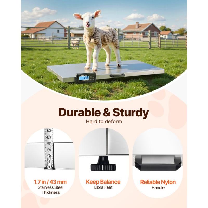 VEVOR Livestock Scale 700LBS, Dog Scales Large Platform 40.6x20.9Inch Stainless Steel Vet Scale Industrial Floor Scale Large Animal Scale Pig Scale Goat Weight Scale Pet Digital ScaleVEVOR 1100Lbs x 0.2Lbs Digital Livestock Scale Large Pet Vet Scale Stainless Steel Platform Electronic Postal Shipping Scale Heavy Duty Large Dog Hog Sheep Goat Pig Sheep Scale 1100lbs Large Capacity Stainless Steel Platform LCD Display Screen Portable Handle Built-in Libra Feet Wide