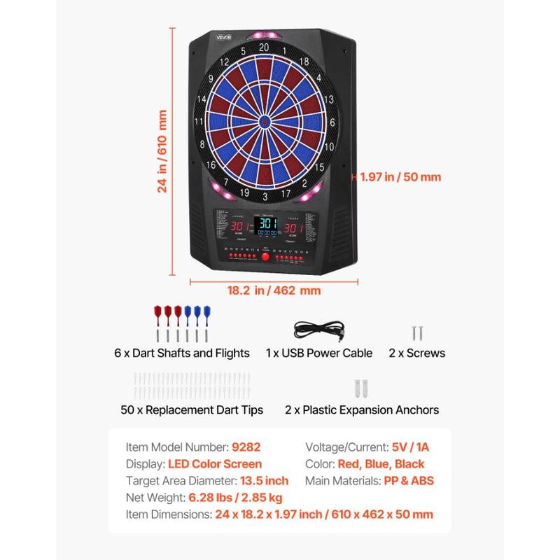 VEVOR Electronic Dart Board, 15.5 Target Dartboard with 43 Games 320+ Variations for Up to 8 Players, 6 Dart Shafts with Flights 50 Soft Tips, Color LCD Scoring Screen for Home Party Game RoomVEVOR Electronic Dart Board, 13.5" Target Dartboard with 45 Games & 474 Variations for Up to 8 Players, 6 Dart Shafts with Flights & 50 Soft Tips, Color LED Cricket Scoring Screen for Home Party Bar Play Freely without Damaging Walls Add More Fun to Your Parties 3-Step Quick