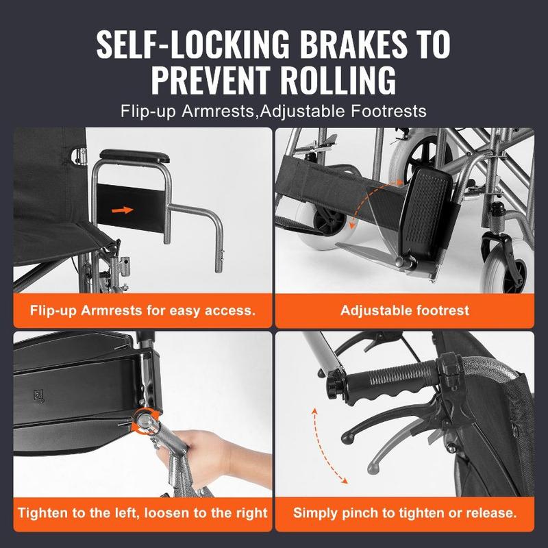 VEVOR Wheelchair, Aluminum Alloy Ultra - Lightweight Transport Chair for Adults, Foldable Cabin Wheelchair with Flip - Back Desk - Length Arms, Self - locking Brake, 15.75 - Inch Wide Seat, 220lbs LoadVEVOR Wheelchair, Carbon Steel Transport Chair for Adults, Foldable Wheelchair with Detachable Armrest, Self-locking Brake, 24-Inch Wide Seat, 300lbs Weight Capacity, for the Disabled Move Freely Lightweight and Foldable Flexible Design Adaptable to Multiple Terrains Comfortable
