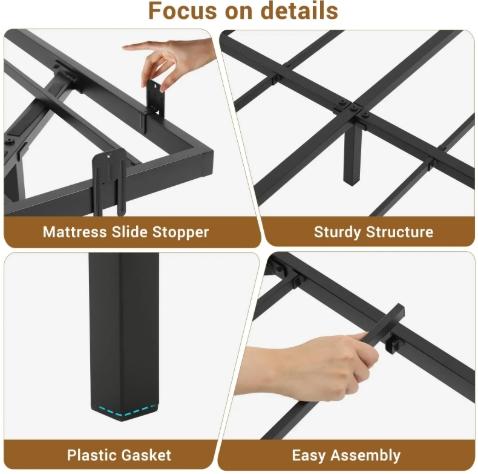 ·[Heavy-Duty Stability & Noise-Free Assurance] Engineered for superior strength and peaceful sleep. The robust metal frame, reinforced with 6 support legs, supports up to 1,500 lbs. Equipped with mattress slide stopper, it guarantees a silent and stable foundation without any annoying shakes or noises.