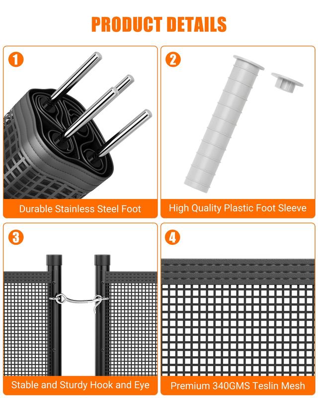 Weatherproof & Unbreakable-Built with rust-resistant stainless steel feet and aluminum frame, this fence withstands harsh weather, wind, and rain. Durable 340gms Teslin PVC mesh resists water, oil, and UV damage.