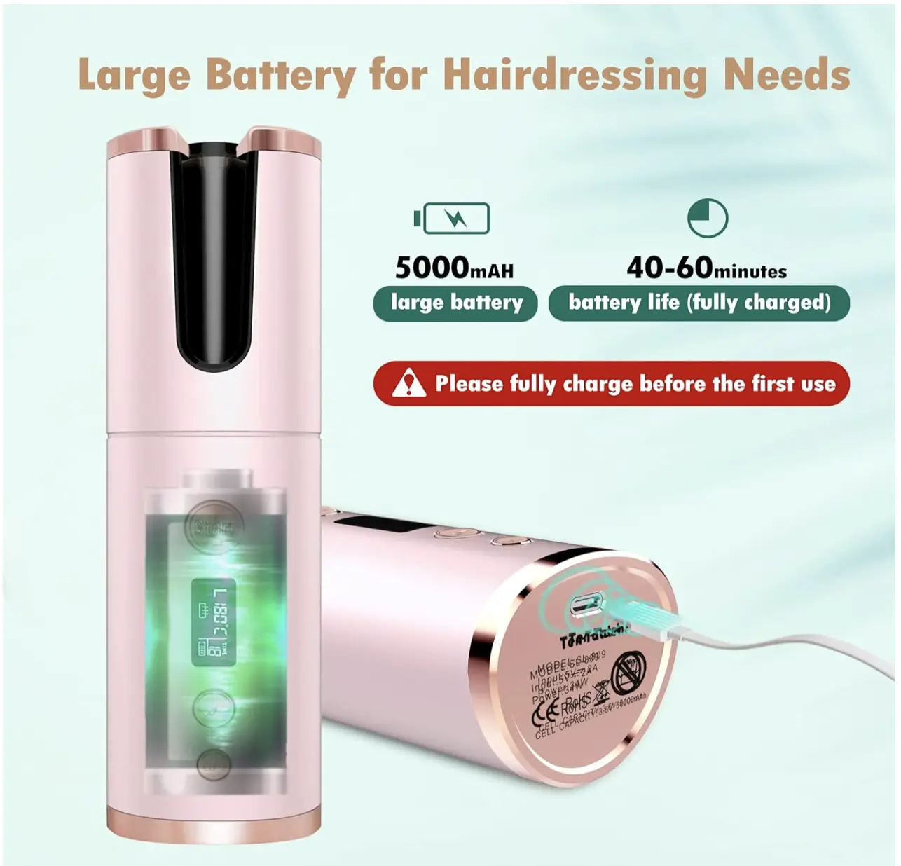 ·【LCD Screen & USB Charging】The LCD digital display can display: heat, timer, curling direction. Built-in 5000mAh,3-4 Hours fully charged time can work for up to 60 minutes. With automatic shutdown function, saving power and ensuring application safety. In addition, it is also a mobile power source, you can use it to charge your phone.