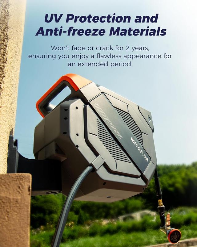 UV and Freeze Protection: Wall-mounted hose reel is designed to withstand harsh conditions and maintain its performance and appearance over time, unaffected by sunlight, rain, or snow