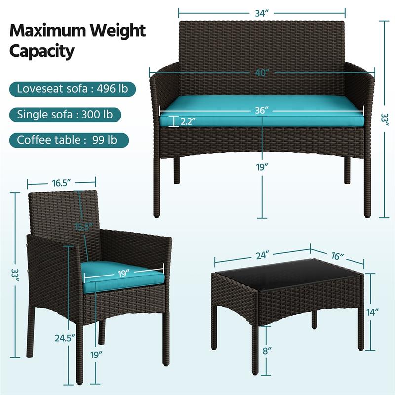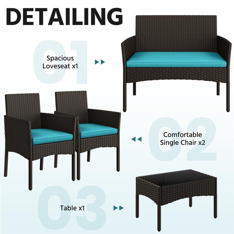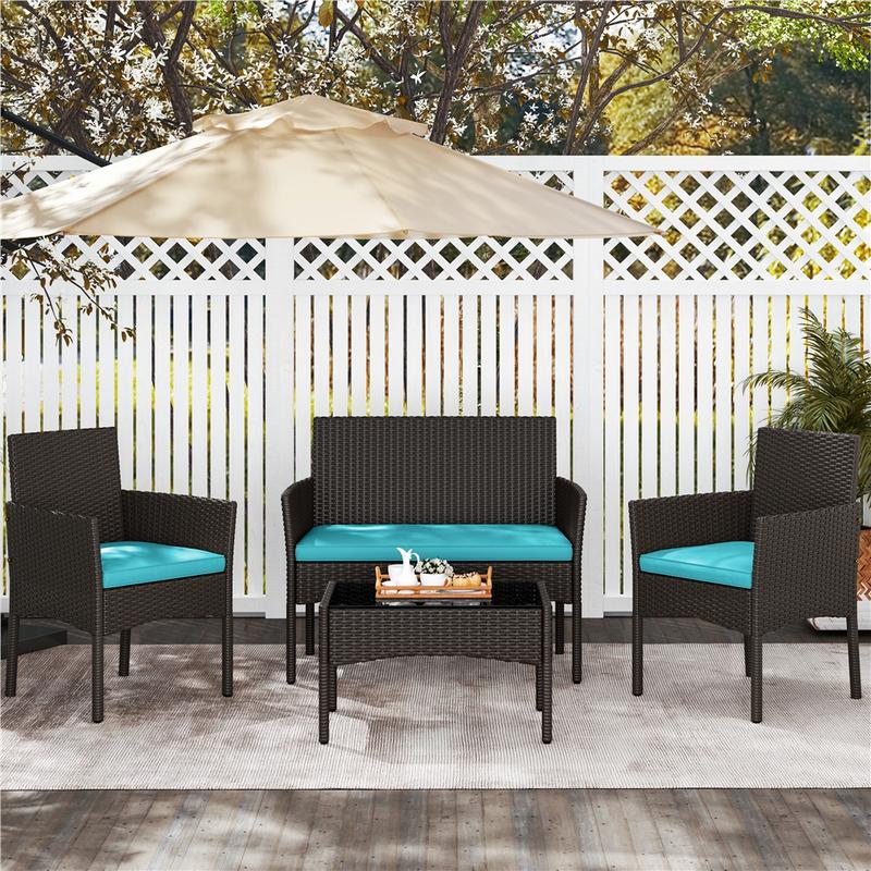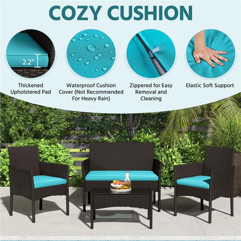 Upgrade your outdoor area with this 4-piece garden set. It includes a loveseat, two single sofas, and a coffee table, all made from durable hand-woven PE rattan. The thick foam cushions and ergonomic backs ensure comfort. The tempered glass tabletop adds a sleek finish. Perfect for relaxing or socializing, this set combines style and practicality.