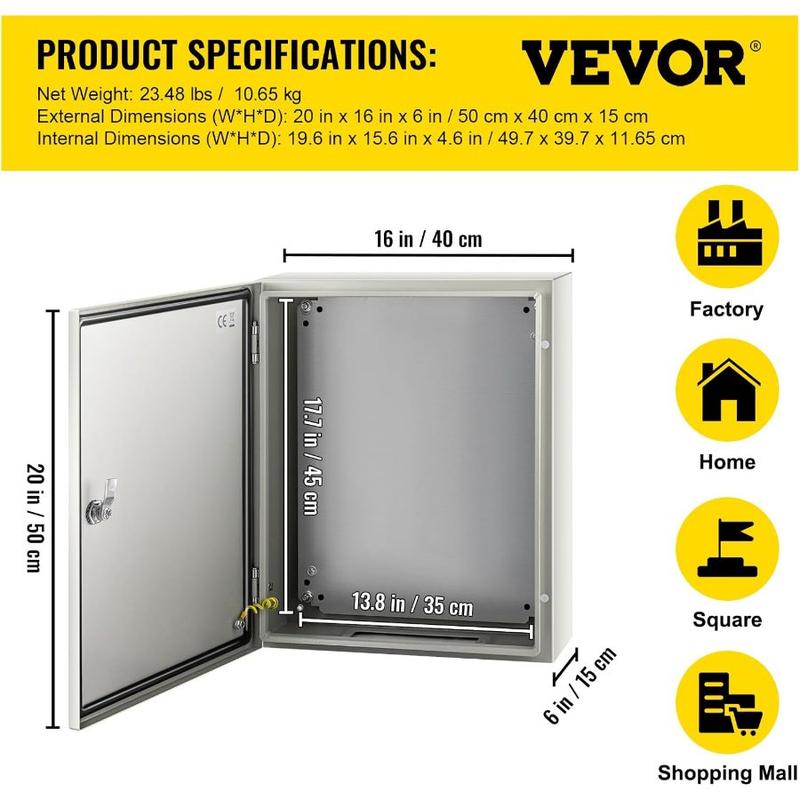 5. VEVOR NEMA Steel Enclosure, 20x 16x 8'' NEMA 4X Steel Electrical Box, IP66 Waterproof Dustproof, Outdoor/Indoor Electrical Junction Box, with Mounting Plate