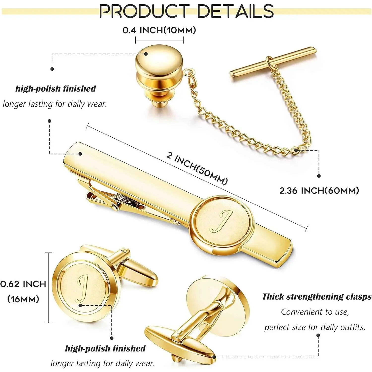 HIGH QUALITY MATERIAL--These tie clips cufflinks and tie pins are made of high quality copper, excellent polishing and electroplating process, sturdy and durable, long color retention. Smooth surface and rounded edge, with sturdy spring, can hold your ties & shirt well, will not move or slide down.