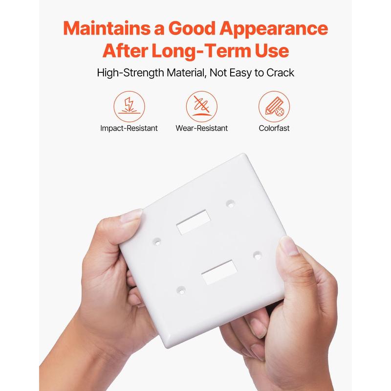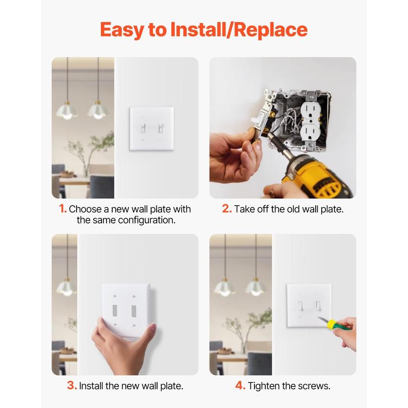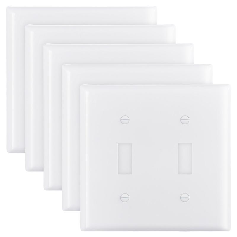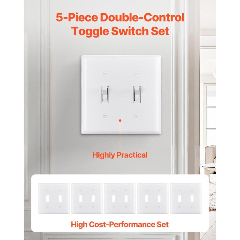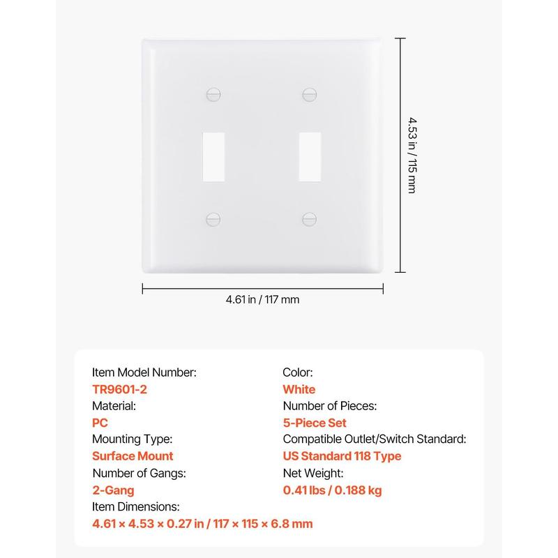 High-Quality Material: Made from polycarbonate thermoplastic, ensuring durability and toughness.It withstands heavy impacts, scratches, wear, and fading, extending the lifespan.Ideal for light switch covers, offering long-lasting protectionFire-Resistant & Heat Tolerant: Excellent flame resistance, meeting fire-retardant test standards, providing extra security protection.Ideal for switch covers and switch plates, ensuring additional security for your electrical devicesWide Compatibility: Standard 118-type size, compatible with most home and commercial conditions, ensuring your equipment matches existing electrical installations without extra modifications.Works seamlessly with outlet coversGlossy Surface: Easy-to-clean high-gloss design, with smooth surfaces and rounded edges that avoid dirt accumulation, while enhancing the overall beauty of your space.The sleek finish of the switch plate adds a modern touchWide Application: Suitable for homes, offices, hotels, and more.Ideal for lighting control or appliance management, enhancing both the beauty and functionality of any space with the right light switch covers or outlet coversVEVOR Toggle Light Switch Wall Plates, 2-Gang Switch Electrical Outlet Covers, Standard Size 4.61in L x 4.53in H Unbreakable Polycarbonate Thermoplastic Faceplate for Receptacle Outlet&Switch(5 Pack, White)