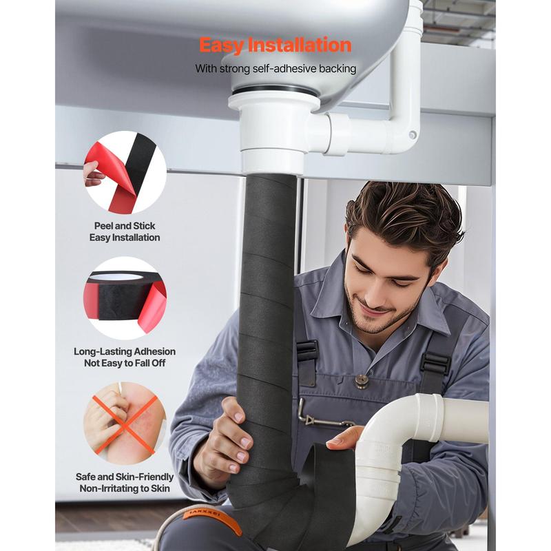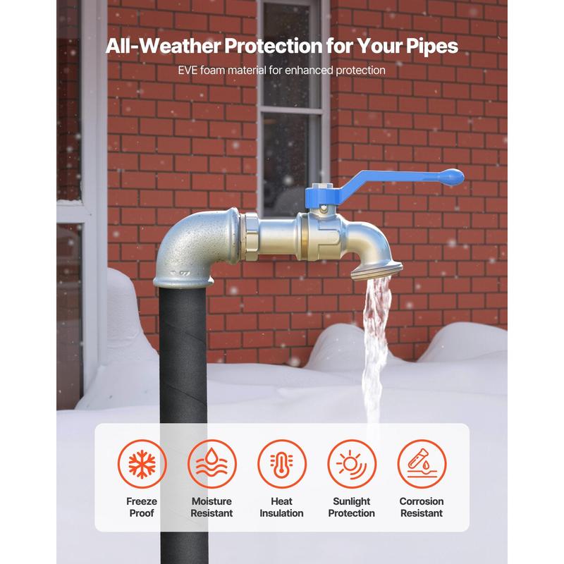 Reliable Pipe Protection: VEVOR 14FT x 2-inch foam pipe insulation wrap is made of 0.17" thick EVE foam.In summer, it protects pipes from high temperatures and scorching sun, while in winter, it locks in heat and prevents outdoor pipes from freezingWeather Resistant: The 0.17-inch thick pipe insulation tape is built to withstand temperatures from 14°F to 176°F. It provides reliable freeze protection, moisture resistance, heat insulation, and sunlight protection, ideal for indoor and outdoor useEasy Installation: With its strong self-adhesive backing, this pipe insulation foam wrap securely sticks to pipes of various shapes and stays in place for long periods without peeling off, eliminating the need for frequent replacementsExtra Long Size: Our pipe wrap insulation tape is 14 ft long and 2 inches wide, providing ample length to offer comprehensive protection for pipes.You can easily cut it to the desired length, making it versatile for various installation scenariosWide Applications: Suitable for central heating pipelines, industrial pipeline systems, residential hot water lines, building HVAC systems, etc, this thermal insulation foam tape offers reliable pipes protection across a variety of applicationsVEVOR Pipe Insulation Wrap, 14 FT x 2-inch Pipe Insulation Foam Tape, Self-Adhesive Water Pipes Insulated Foam Wrap for Winter Freeze Protection, Heat & Cold Resistant for Outdoor Indoor Use
