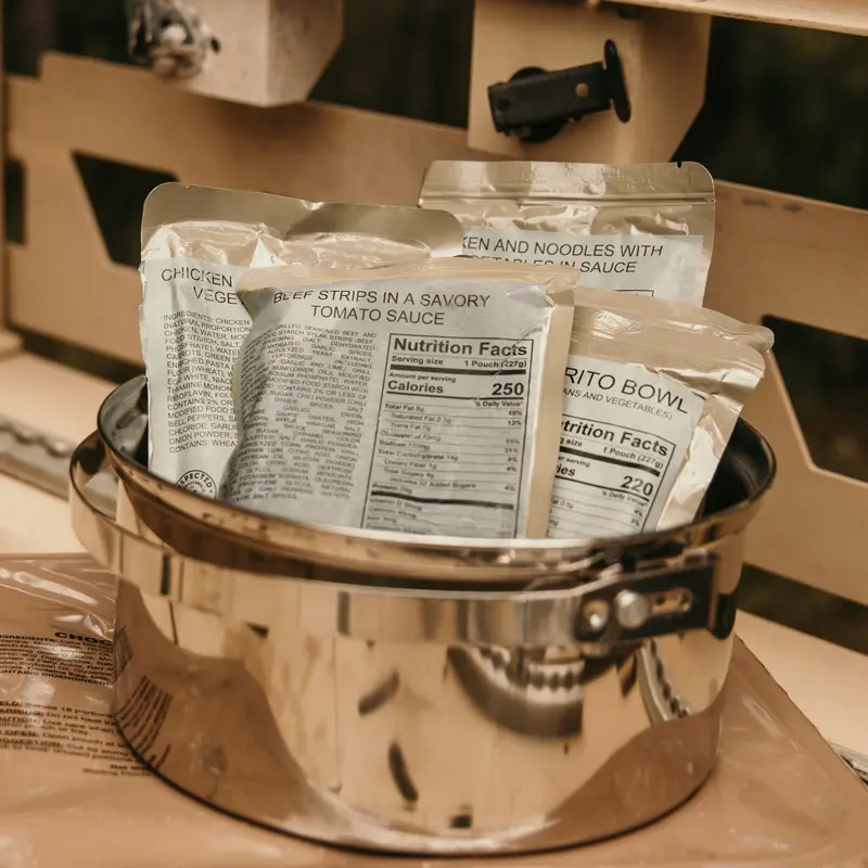 No refrigeration, hydration, or cooking required. Every item is fully prepared and shelf-stable for 3 years or more.