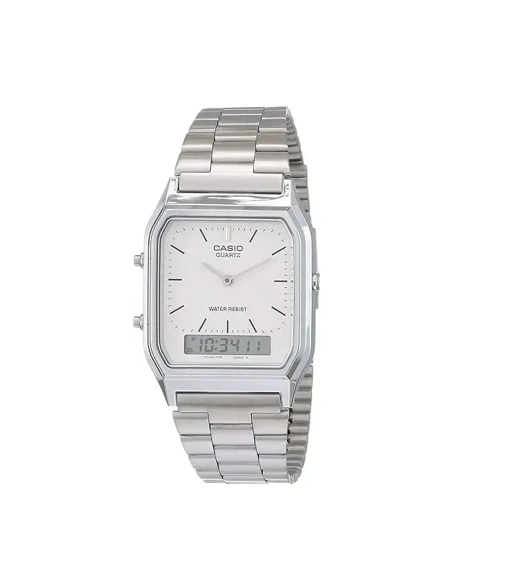 The new Casio AQ-230A-7D watch features a sleek stainless steel band in silver tone, complemented by a white dial with stick indexes. This dual time watch has a quartz movement and comes with original box and manual. With a case size of 29.8mm and a case thickness of 8.1mm, this rectangle shaped watch is suitable for both men and women. The watch also includes a snap caseback and a brushed silver finish, making it a stylish and reliable accessory for everyday wear.